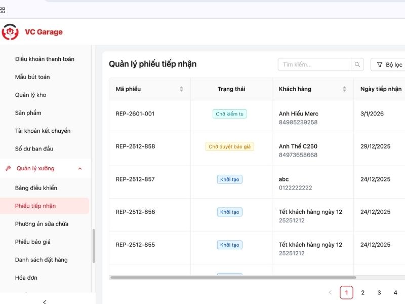 - Ghi nhận đầy đủ thông tin khách hàng, xe, tình trạng ban đầu và nhu cầu sửa chữa